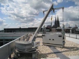 We offer our Building Maintenance Unit = BMU in different variations. Depending on the field of operation, we manufacture special systems which comply 100% with the requirements of the stringent safety standards and with your expectations. Whether permanently installed or rail-mounted systems (for example, at roof level) – Wahlefeld elevators provide you with custom-made products. Despite their compact construction, our systems achieve an extension of up to 40m and are at the forefront on the market with respect to performance thanks to their 4x telescoping ability.
